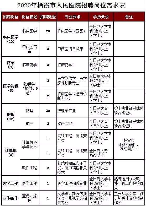 为充分满足栖霞百姓的健康需求及医院快速发展的需要,按照《事业单位人事管理条例》(国务院令第652号)等相关规定,栖霞市人民医院面向社会公开招聘工作人员69名。现公告如下:
