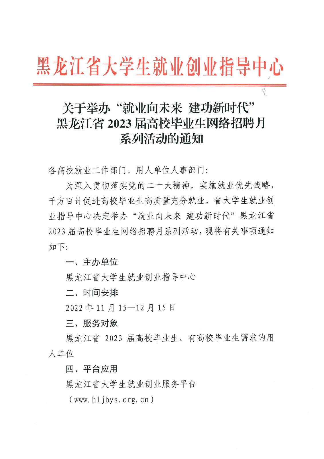 关于举办“就业向未来 建功新时代”黑龙江省2023届高校毕业生网络招聘月系列活动的通知
