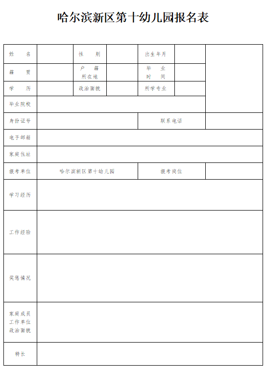 哈尔滨新区第十幼儿园(原广信二期幼儿园)是一所全日制公办幼儿园,隶属于哈尔滨市松北区教育局。位于哈尔滨市松北区东北亚大街1992号。根据《哈尔滨新区江北一体化发展区新型公办幼儿园办园模式改革方案》相关要求,面向社会公开招聘。现将有关招聘事宜公告如下: