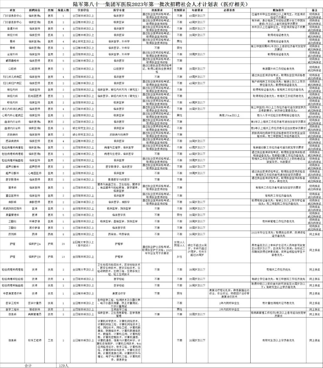 坚持德才兼备、以德为先的用人标准,按照公开、公平、择优的原则实施招聘工作。本次招聘聘用合同制工作人员147人,具体岗位、人数、条件等详见《集团军医院2023年第一批次招聘社会人才计划表》。应聘人员可通过以下方式查询招聘信息:“陆军第八十一集团军医院”微信公众号;张家口市金桥人力资源开发服务中心网站(https://www.zjkjqrl.com/);“张家口金桥人力资源开发服务中心”微信公众号。1.政治要求:具有中华人民共和国国籍,拥护中国共产党的领导,具有良好的政治素质和道德品行,热爱军队卫生事业,遵纪守法,未参加过邪教等非法组织,自愿为军队医院建设服务;2.身体要求:身心健康,五官端正,形象气质好,符合本院聘用专业技术人员体检标准(具体项目和标准参照《公务员录用体检通用标准(试行)》执行);3.资质要求:具有国家承认的招聘岗位所需专业的学历、专业知识及业务能力;1.因个人品德或造成严重行政责任事故、有执业不良记录等原因,被原单位解除劳动关系者。2.造成三级以上医疗事故未满两年或造成二级医疗事故者。6.提供虚假简历材料、在考核面试中有严重违纪违规行为者。本次招聘采用现场、扫码线上报名和网上报名的方式,每人只能报考一个岗位。报考类别为医类的人员,可通过现场或扫描下方二维码线上报名的方式进行报名。现场报名时须携带本人符合报名条件的户口本、身份证、毕业证、《教育部学籍在线验证报告》、《应聘申请表》(见下表)、按照岗位资质要求相关证件以及其他优先条件的相关资料的原件、复印件各1份到陆军第八十一集团军医院政治工作处聘用人员办公室进行现场报名、资格审核。