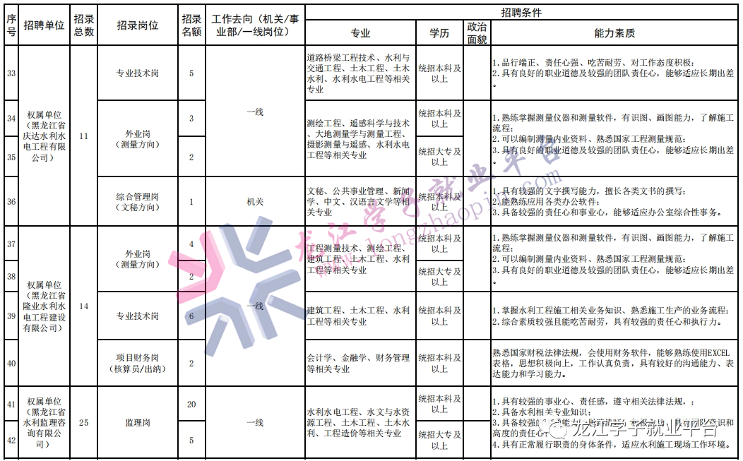 黑龙江省水利投资集团有限公司(以下简称水投集团)是在黑龙江省全面深化国资国企改革、组建成立7大省级产业投资集团的背景下,以省水利水电勘测设计研究院为主体组建成立的,于2020年1月15日在哈尔滨新区注册,2020年9月26日授牌,认缴注册资本100亿元,是建投集团二级全资子公司,现有机关职能部门10个、事业部3个,权属单位22家。 水投集团作为省级水利投融资平台,被省政府赋予“省级及以上水利工程项目、省内跨流域跨区域水利工程项目投资主体(项目法人)、国有水利资产运营管理主体和市场主体”三大功能作用,具备“谋融投建管营”一体化发展优势,统筹省级及以上水利基础设施的投融资、规划设计、建设施工和运营管理,为龙江水利行业提供整体解决方案和“谋融投建管营”全产业链服务。目前有公益服务、勘测设计咨询、融投建管、运管养护4大主营业务板块与1个新形态业务板块。主要负责水利水电行业及涉水相关基础设施投资、建设、管理、运营及相关服务等;开展水利规划咨询、勘测设计、水资源管理、防洪除涝设施管理及运营维护、灌溉服务等水利传统业务,以及智慧水利、城乡水务、水环境和水生态综合治理、新能源、抽水蓄能、污水处理、生态渔业、水权交易、水文化建设及水利科技研发等涉水产业业务。现面向高校进行2024年度招聘。 一、招聘岗位 详见《水投集团2024年度高校招聘需求计划表》。 二、福利待遇 1.薪酬待遇:薪酬包括岗位工资、绩效及各项津补贴。 2.职业发展:必要的职业培训和良好的职业发展空间。 3.福利待遇:五险一金、带薪年假、节日福利、午餐补助及年度体检等福利,部分单位享受人才引进政策。 三、招聘条件及要求 1.拥护中国共产党的领导,具有强烈的使命感和责任感,遵纪守法、品行端正、诚信廉洁、勤奋敬业,具有攻坚克难的坚强毅志,具备良好的团队合作精神和沟通能力,具有良好的职业道德和职业操守。 2.熟知行业相关法律法规,具有较丰富的专业知识。 3.认同集团企业文化,主动融入企业核心文化和价值观。 4.身体健康,具有正常履行职责的身体条件。 四、招聘程序 1.报名方式:网络报名,每位应聘者限报1个岗位。应聘者需下载附件《黑龙江省水利投资集团有限公司应聘报名表》,将《应聘报名表》和相关材料填写完整后发送至指定电子邮箱报名(压缩包文件名称为“申报单位+岗位+姓名”),邮件主题为“水投2024年校招+申报单位+岗位名+姓名”。应聘者报名时需按规定格式填写《应聘报名表》(须在表内粘贴电子版1寸近照),并另附与应聘岗位相关的个人业绩详细说明及证明材料的原件扫描件,身份证、学历证书、学位证书等原件扫描件。所有扫描件须按证书证件全称命名,材料不全者不予接受。 邮箱:hljstrlzy@126.com 2.资格审查:资格审查与报名同步进行,严格按照招聘公告的条件要求开展资格审查工作。应聘者应对提交资料的真实性负责,凡弄虚作假者,一经查实,取消应聘资格。资格审查通过后将通过电子邮件或电话方式通知参加后续环节,资格审查未通过者,不再另行通知。 3.能力测试:根据岗位要求采取不同的测试形式,以笔试、面试为主,每个岗位的具体测试形式以资格审查后反馈通知为准。一般能力测试按照笔试、面试的顺序进行,笔试合格后方可进行面试。根据笔试成绩由高到低不超过1:3比例确定面试人选(不足1:3的按实际人数,如第三名出现并列成绩则一同进入面试),面试成绩低于70分不予录用。 4.确定意向人选:面试结果经集团党委会研究确定拟录用人选。若经考察调查,同一职位所有考察对象均不符合任职要求的,可取消该岗位的招聘。 5.综合考察:根据招聘岗位需要,对拟录用人选进行背景调查、资格复审、档案核查、政审考察和体检,过程中发现有不符合录用条件的,取消录用资格。 6.结果公示:综合面试成绩、综合考察的结果,确定最终拟录用人员名单,在集团网站及微信平台公示。 7.办理入职:公示结束后,如无任何异议,被录用人员应在规定时间携相关材料到人力资源部报到,签订劳动合同,确定试用期。试用期满后,经考核合格者,正式录用;考核不合格者,解除劳动关系。 五、其他事项 1.应聘人员须认真如实填写《应聘报名表》。因未认真填写造成信息不全、有误的,由应聘人员承担责任;弄虚作假的,取消应聘资格。 2.未尽事宜及最终解释权归黑龙江省水利投资集团有限公司。 咨询电话:0451-51668121、86382031 咨询时间:周一至周五上午08:30-11:30,下午13:30-17:30