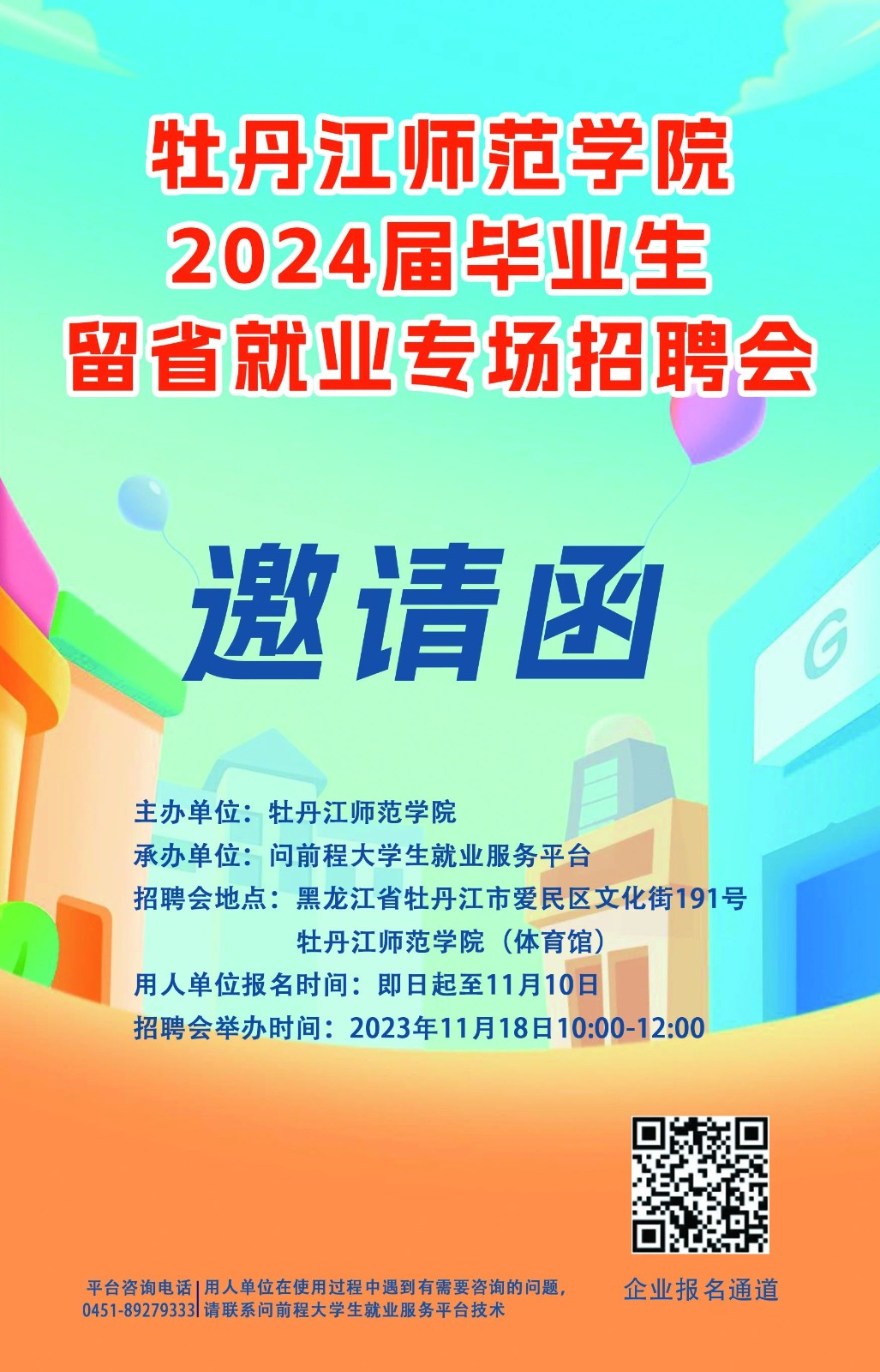 为做好我校2024届毕业生就业工作,持续为毕业生与用人单位之间搭建供需沟通桥梁;我校联合问前程大学生就业服务平台,拟于2023年11月18日举办“牡丹江师范学院2024届毕业生留省就业专场招聘会”,现诚邀贵单位报名参会,招聘英才。