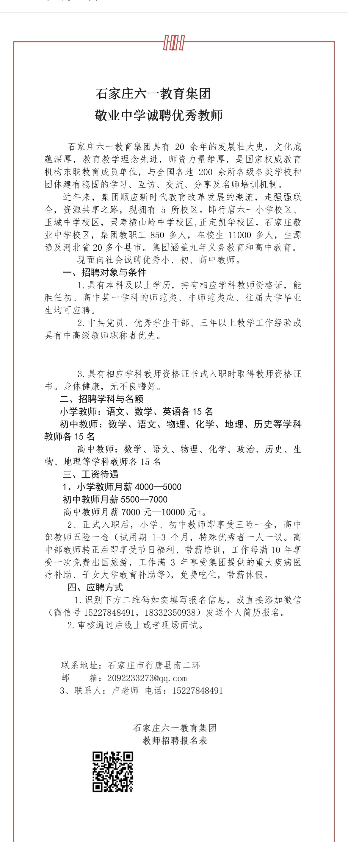 石家庄六一教育集团敬业中学优秀教师校园招聘公告