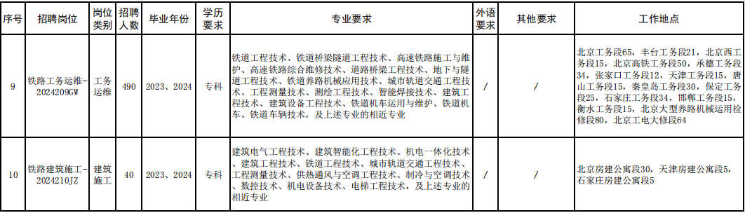 中国铁路北京局集团有限公司根据企业发展需要,招聘普通高校大专(高职)学历毕业生。具体事宜公告如下.