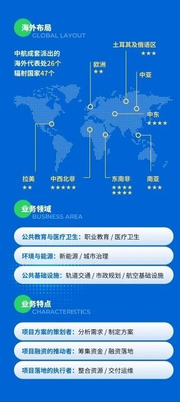 中航国际成套设备有限公司(隶属中国航空工业集团)致力于提供海外公共教育与医疗卫生、环境与能源、公共基础设施的整体策划解决方案与增值服务,主导海外政府级项目策划与执行,助力“一带一路”建设。