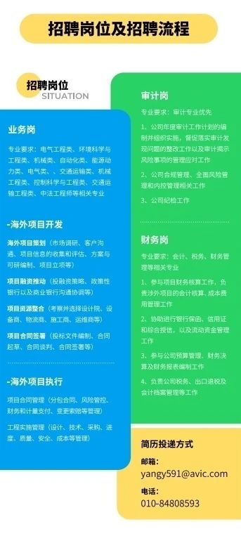 二、招聘岗位 业务岗:助理业务经理(中法/理工科/电力/轨道交通等专业优先) 职能岗:助理职能经理(审计/会计学/财务管理等专业优先) 实习机会:开放研二学生寒暑假实习,表现优异者有机会留用! 三、招聘对象 2026届应届硕士毕业生(2025届应届硕士毕业生春招同步进行中),具备英语6级or法语B2等语言能力者优先。 四、薪资福利 国内首年年薪20W+,海外30W左右。 北京户口、员工宿舍、六险二金、住房补贴、海外津贴、工会及节日福利、年度体检等。 职业晋升双通道:管理岗/专业岗双向发展,轮岗/海外轮驻机会。 五、应聘方式 邮箱投递:yangy591@avic.com(标题:姓名+岗位+学校) 六、特别福利 实习期间,提供宿舍、食堂,实习工资+留用机会! 有机会去海外项目实地学习,快速成长! 咨询联系:杨女士 010-84808593/150-1009-7506