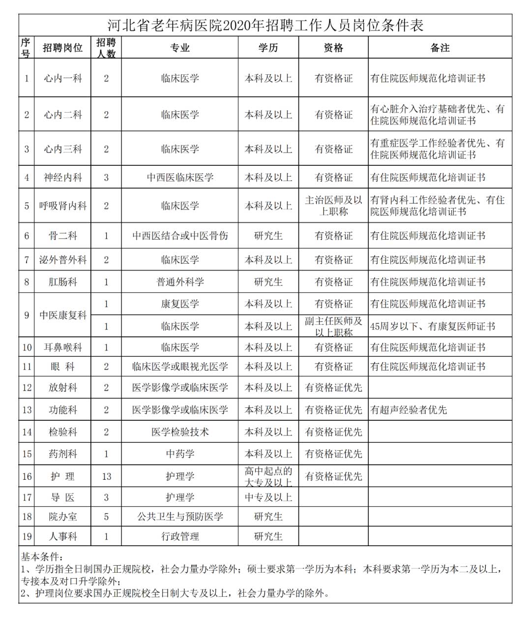 具体岗位条件详见《河北省老年病医院2020年招聘工作人员岗位条件表》