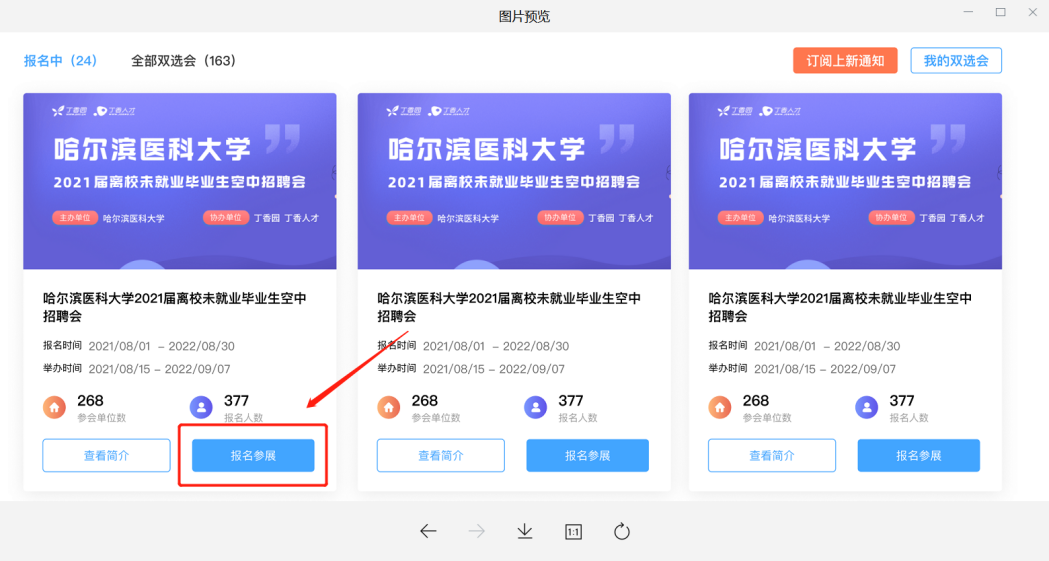 3.点击企业管理后台左侧“高校双选会”,选择需要报名的高校招聘会场次进行报名(新注册用户自动进入招聘会报名页面)