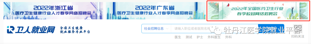 做好新冠肺炎疫情常态化下的毕业生就业工作,促进22届医药卫生类院校毕业生更充分更高质量就业,我校联合国家卫生健康委人才交流服务中心下属“卫人就业网”,定于2022年3月28日—4月15日在线举办“2022年全国医药卫生行业春季校园网络招聘会(牡丹江医学院专场)”,为用人单位和毕业生搭建线上交流平台。现将有关事项安排如下: