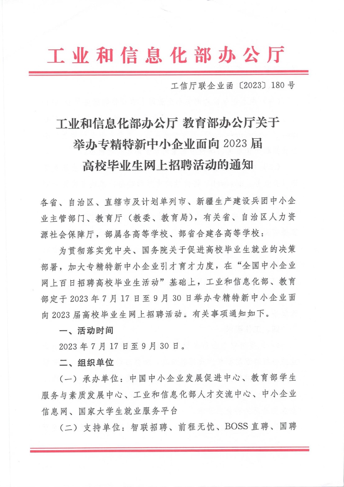 工信部办公厅 教育部办公厅关于举办专精特新中小企业面向2023届高校毕业生网上招聘活动的通知