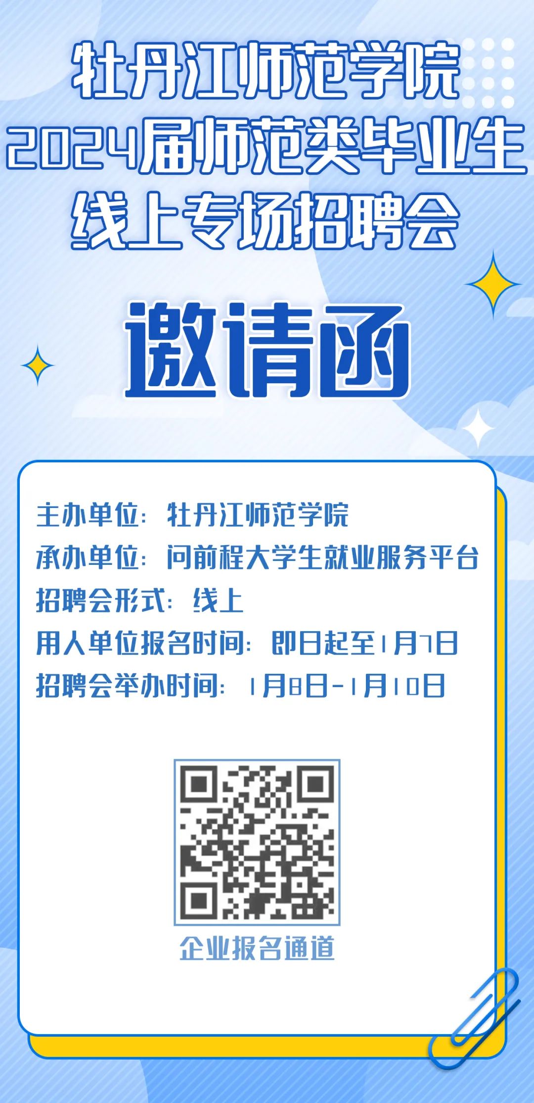为做好我校2024届毕业生就业工作,持续为毕业生与用人单位之间搭建供需沟通桥梁;我校联合问前程大学生就业服务平台,拟于2023年1月8日举办“牡丹江师范学院2024届师范类毕业生线上专场招聘会”,现诚邀贵单位报名参会,招聘英才。
