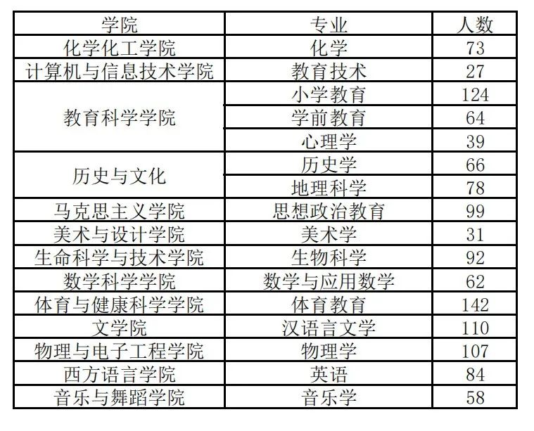 1月8日 | 化学、教育技术、小学教育、学前教育、心理学、历史学、地理科学、思想政治教育、美术学、生物科学、数学与应用数学、体育教育、汉语言文学、物理学、英语、音乐学 |