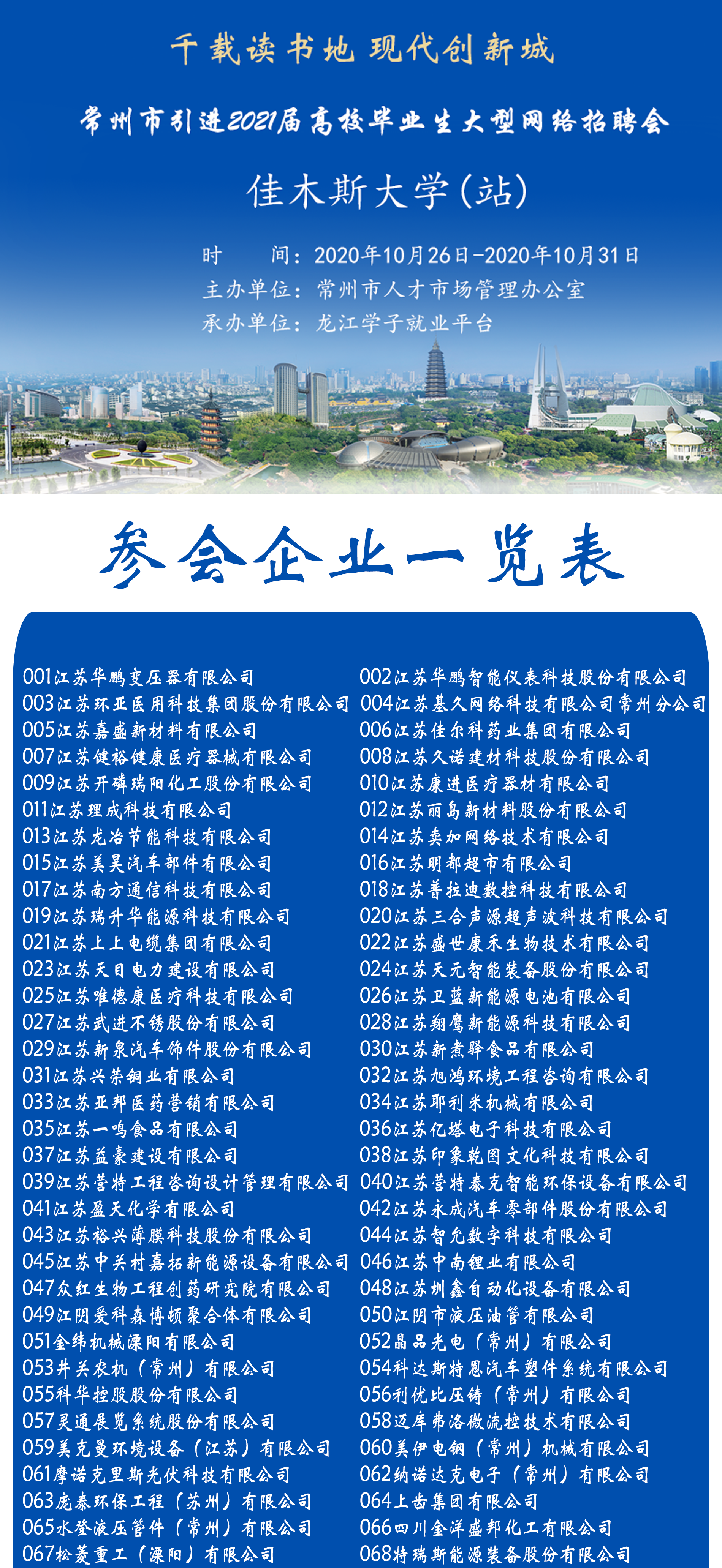 【佳木斯大学站】江苏省常州市373家企业引进万名人才大型网络招聘会