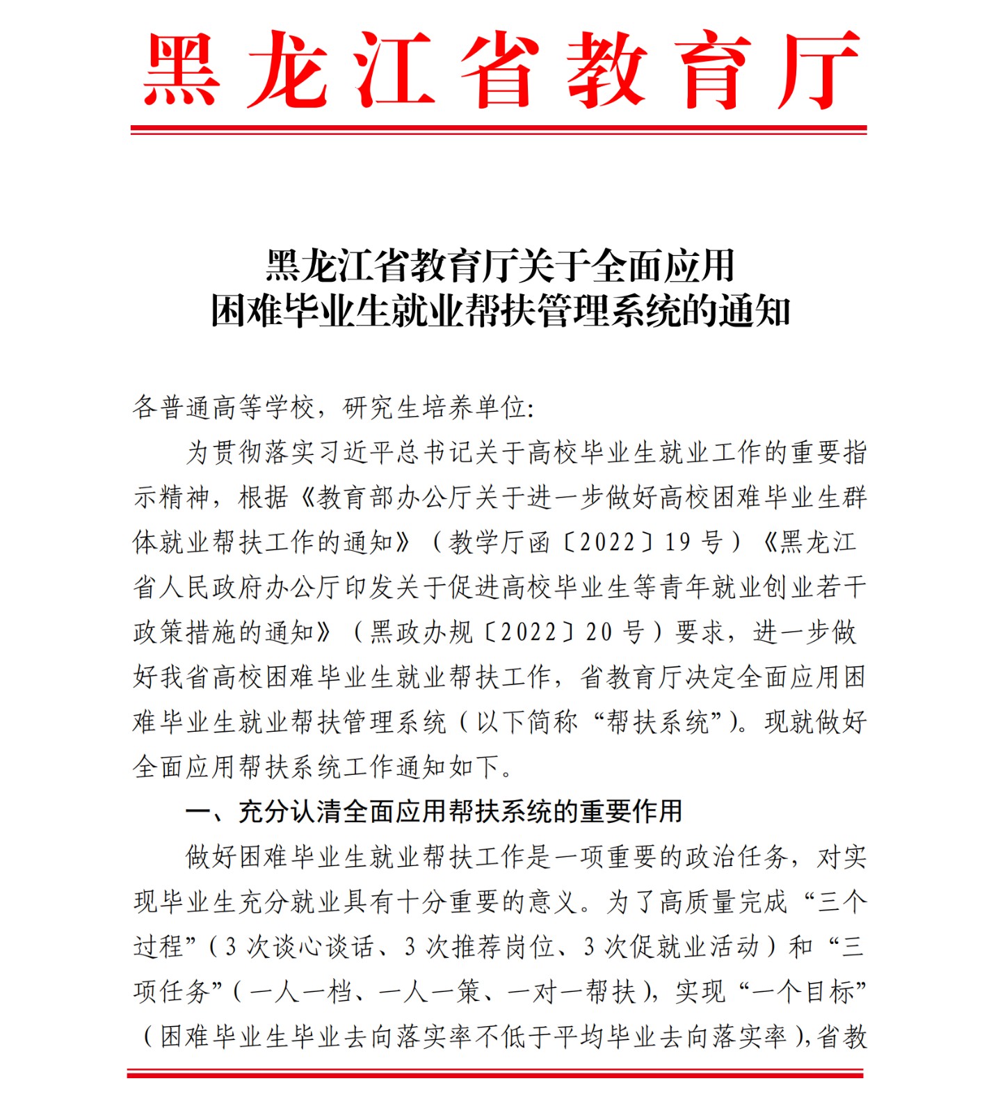 黑龙江省教育厅关于全面应用困难毕业生就业帮扶管理系统的通知