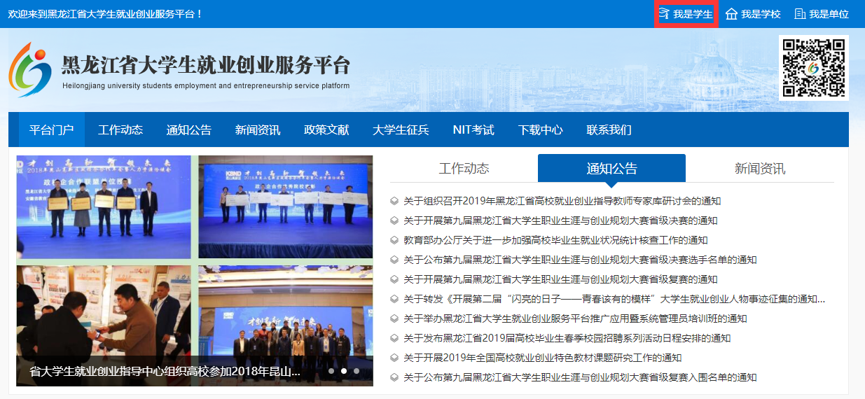 打开黑龙江省大学生就业创业服务平台,http:/,点击我是学生,如下图所示:(使用手机注册可能导致信息显示不全)