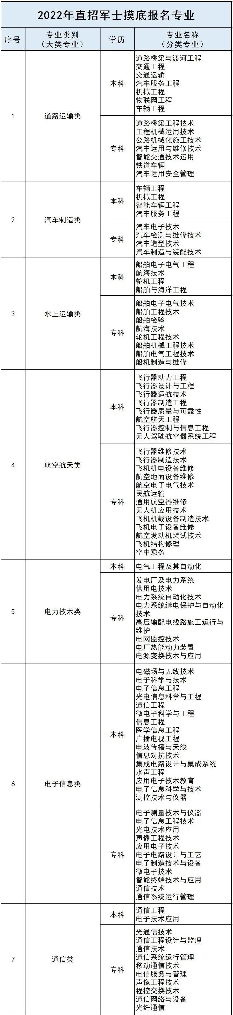 招收专业:经初步统计,2022年直招军士涉及道路运输、汽车制造、电子信息、通信、计算机、机电设备、机械、医药等400余个军民通用专业。
