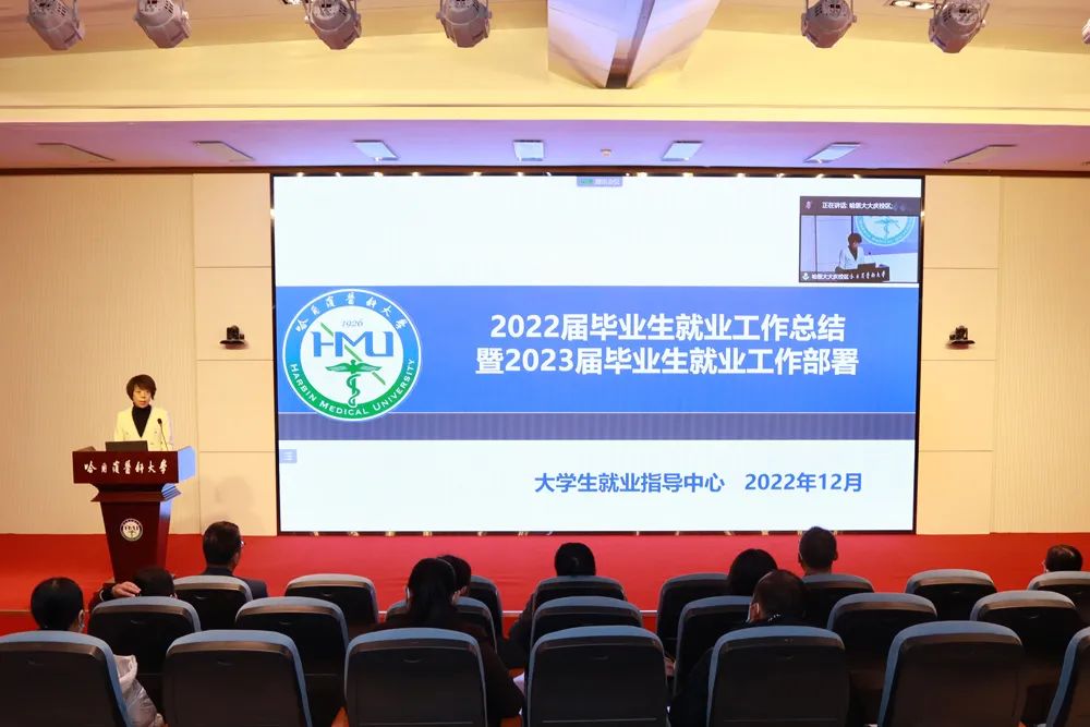 为贯彻落实教育部2023届全国普通高校毕业生就业创业工作网络视频会议精神,12月16日,哈尔滨医科大学大庆校区召开2022届毕业生就业工作总结暨2023届毕业生就业工作部署会议。学校党委书记孙瑞岐教授,校长乔远东教授,副校长孙宏丽教授,党委副书记李国军教授与学生就业工作有关的各院系及职能处室的相关人员通过线上线下相结合的方式参加会议。副校长宋印利主持会议。