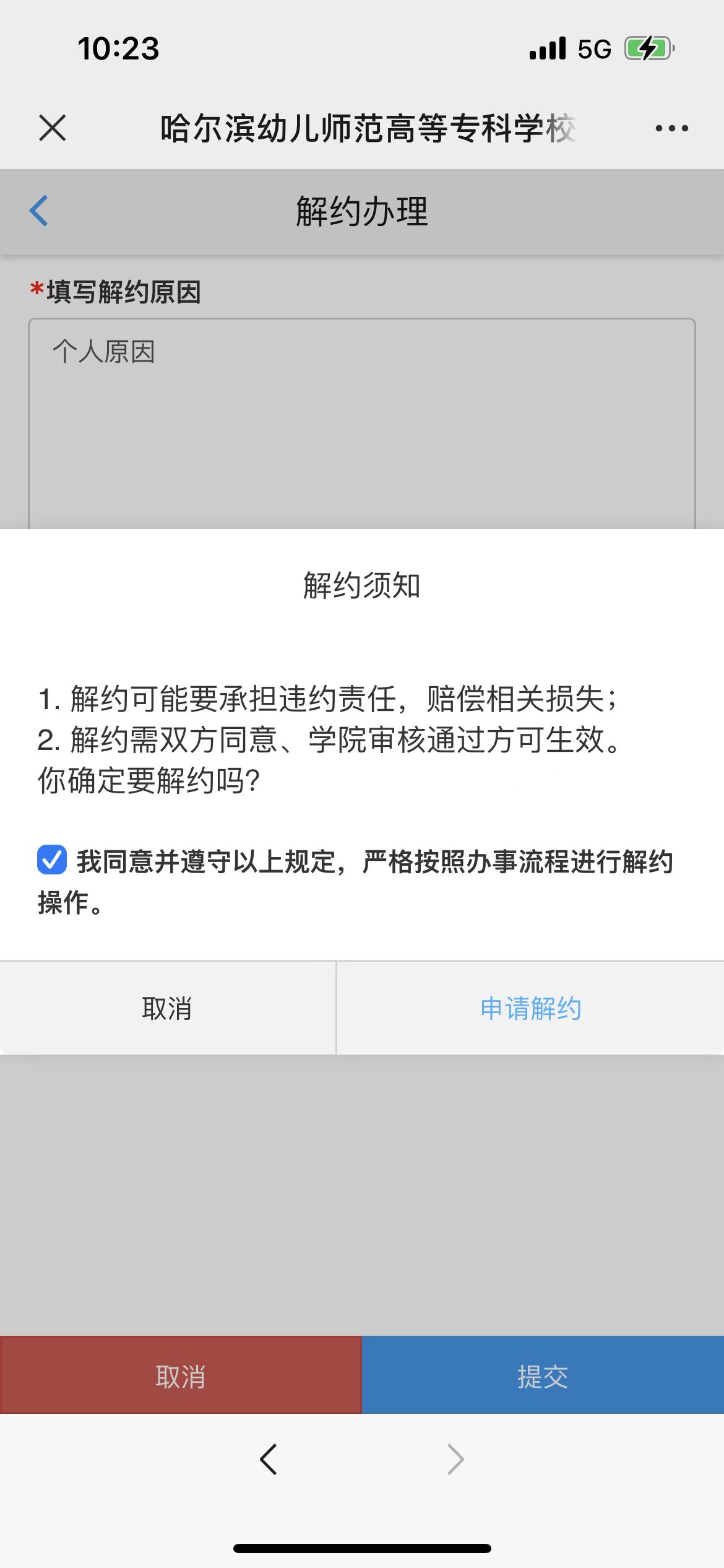 填写解约原因---提交---申请解约,等待签约单位及学校审核。如图