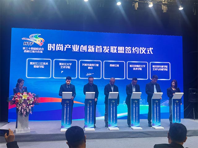 5月17日,第三十四届哈洽会西城红场分会场迎来重要时刻。在各方代表的共同见证下,黑龙江三江美术职业学院与哈尔滨市南岗区人民政府、黑龙江省服装鞋帽行业协会、辽宁省纺织服装协会、哈尔滨红博商业等政府及行业机构,以及黑龙江大学艺术学院、哈尔滨师范大学美术学院、哈尔滨华德学院艺术与传媒学院等高校,共同签署《时尚产业创新首发联盟战略合作协议》。这一里程碑式的合作,标志着东北地区时尚产业协同发展迈入新阶段。