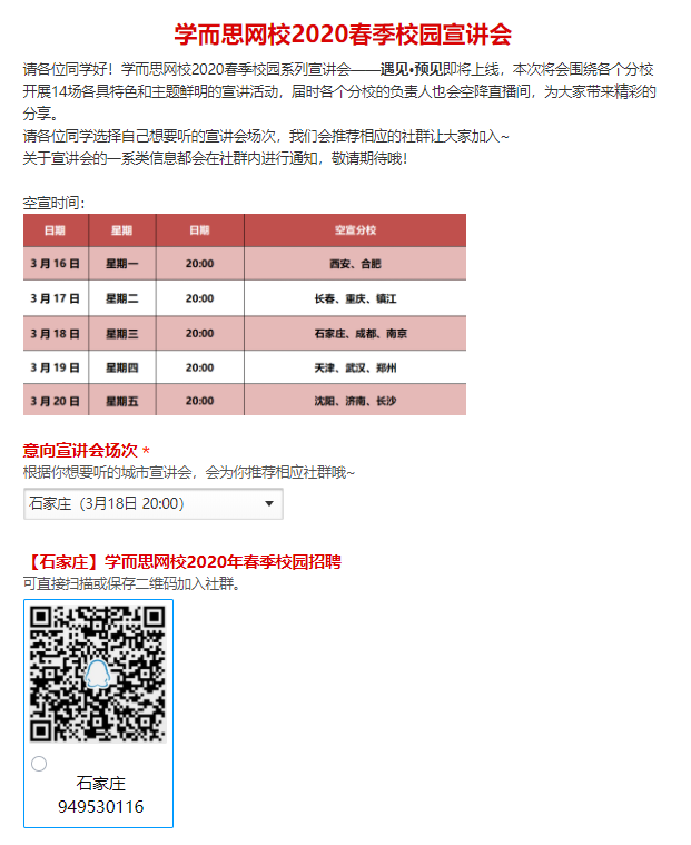 经与学而思网校HR沟通、确认,现将学而思网校2020春季校园云宣讲会信息公布如下,欢迎有意的同学积极参与